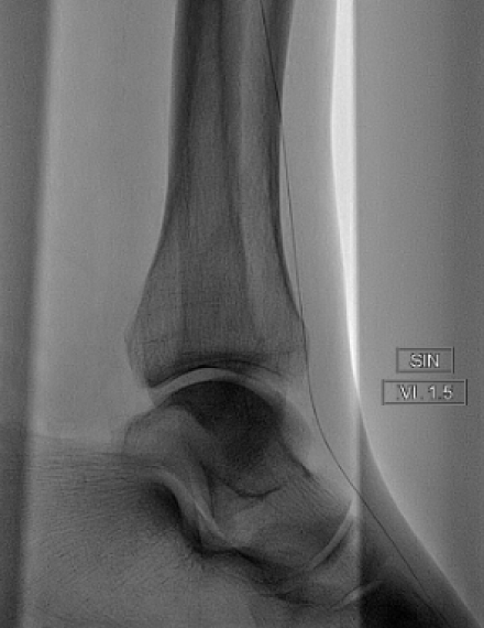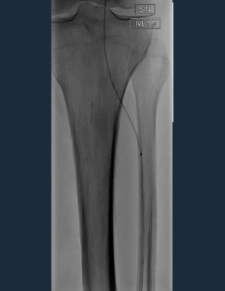 Baseline angio shows a total occlusion of the anterior tibial artery (ATA), with a diffuse lesion of 30 cm length.​ Ankle-brachial index (ABI) pre procedure: 0.30.