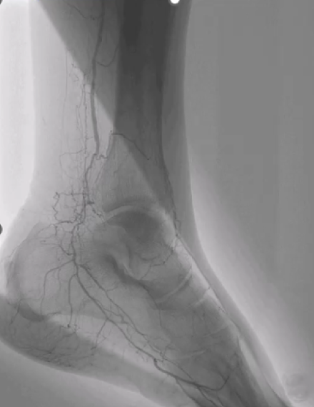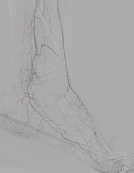 Foot angio shows direct flow from the anterior tibial artery into the dorsalis pedis and increased perfusion to the heel.